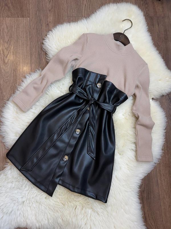 Улюблена моделька сукні Стильна та модна сукня тканина термотрикотаж+еко шкіра на замшіприкрашено декоративними гудзиками є поясок РЕКОМЕНДУЮ! 🎈140(немає)-довжина 71,пог 37,рукав 45 🎈146(немає)-довжина 72,пог 38,рукав 48 🎈152(1 шт)-довжина 76,пог 40,рукав 51 🎈158(немає)-довжина 79,пог 42,рукав 53 🎈164(немає)-довжина 82,пог 44,рукав 55