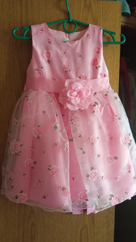Дитяча сукня приблизно на 3 роки. Вдягли один раз на свято. Довжина від плеча до низу 62 см, талія 31 см. Підкладка бавовна, верх віскоза. Троянда на булавці, можна зняти