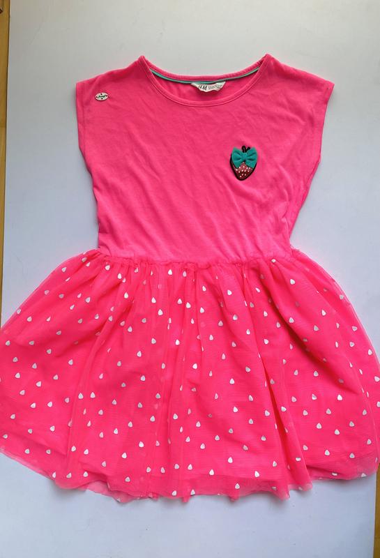 Очень красивое и пышное платье на девочку 8-10 лет (134/140 см) от бренда H&M. Оно розового цвета с изображением блестящей клубники и зеленый фати в виде листочка. Юбка из фатина с изображением маленьких беленьких клубинок. Идеальное состояние. Эффектов нет.