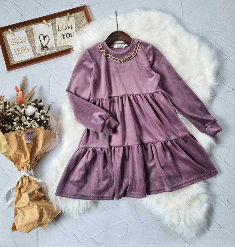 Чудове платтячко для дівчинки королівський велюр приємне до тіла прикрашено ланцюжком якість люкс 140(1 шт) - пог 35 см, довжина 73 см, рукав 50 см 146(1 шт) - пог 36 см, довжина 75 см, рукав 52 см