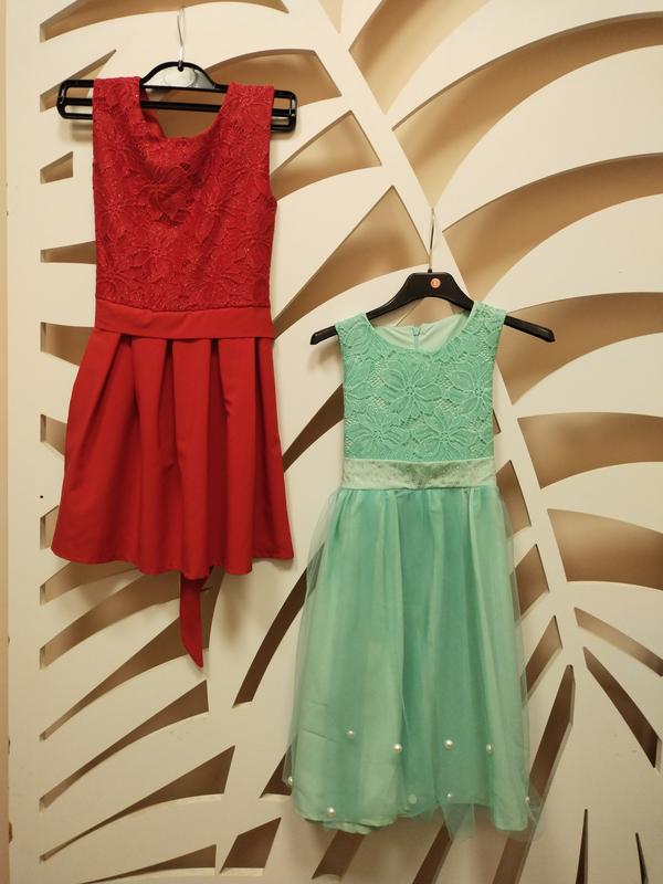 Платье нарядное, праздничное на 5-7 лет. Замеры красного платья: Довжина верху 31 см, юбки 36 см Полуобъем под рукавами 33 см Полуобъем в талии 30 см Замеры мятного платья: Довжина верху 25 см, юбки 45 см Полуобъем под рукавами 30 см Полуобъем в талии 30 см