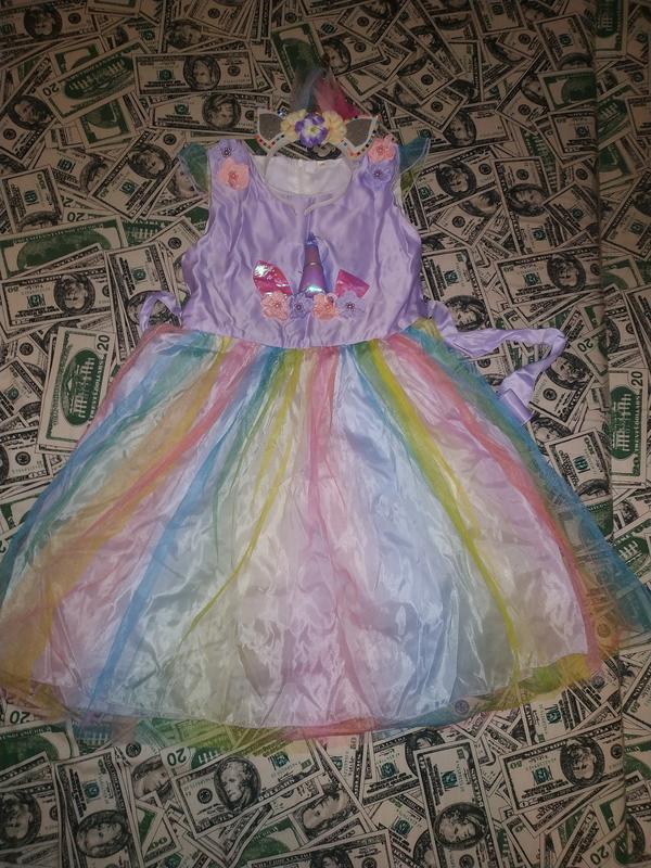 платье единорога в комплекте с обручем - включается подсветка и мигает. Одевали один раз.