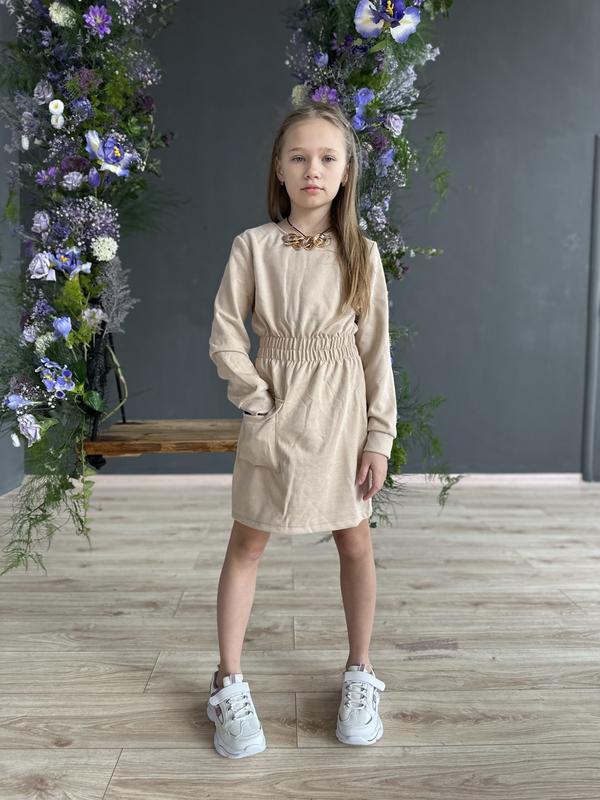 Сукня для справжньої леді. Трикотаж- котон. Сзаду на блискавці. Одна накладна кишеня. В поясі- широка гумка. Розміри: 134– рукав 49, довжина 67 140 – 52/ 72 146 – 54/ 76 152 – 58/ 80 158 – 60/ 83 Ціна: 580 грн