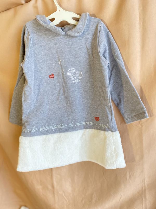 Тепла новорічна сукня. На флісі. По низу йде штучне м'яке хутро. довжина 44, рукав 30. Одягали один раз, після прання.