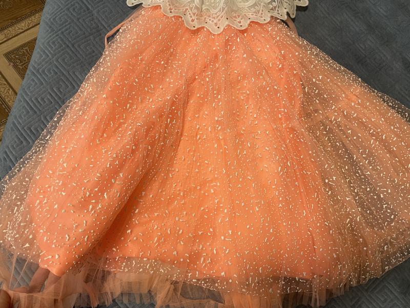 Красивое платье в идеальном состоянии, в живую значительно шикарнее чем на фото. Размер около 128, но лучше ориентироваться на замеры. Красивый яркий персиковый цвет.