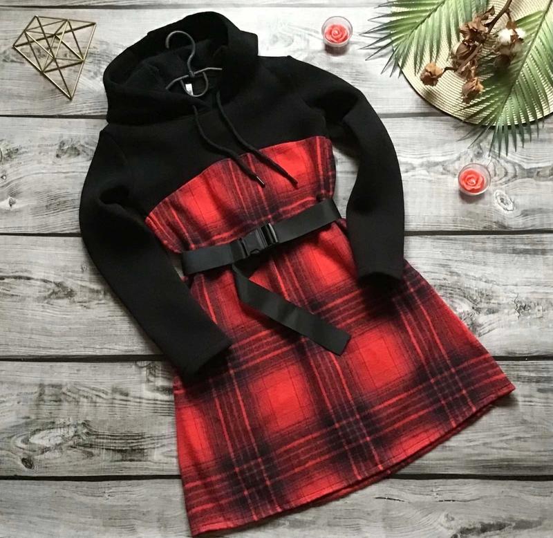 Теплое платье с капюшоном Есть карманы в боковых швах. Пояс в комплекті. Ткань - трехнитка с начесом и клетка кашемир. Замеры: 128 длина - 69см, полуобхват груди - 37см, рукав от плеча - 47см. 134 длина - 72см, полуобхват груди - 38см, рукав от плеча - 49см. 152 длина - 81см, полуобхват груди - 43см, рукав от плеча - 52см. 158 длина - 83см, полуобхват груди - 44см, рукав от плеча - 54см.