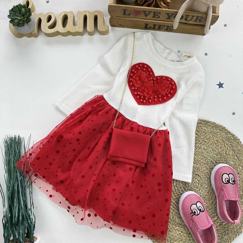 Ніжна та стильна сукня з сумочкою в комплекті! Верх- тканина вафелька, спідниця – кількашаровий фатин із трикотажним підкладом. Спереду прикрашено об’ємною нашивкою. Ззаду- застібається на потаємну блискавку та пояс. Розміри: 98 – рукав 34, довжина 55 104 – 35/ 57 110 – 38/ 59 116 – 39/ 62 122 – 42/ 65 Ціна: 655грн