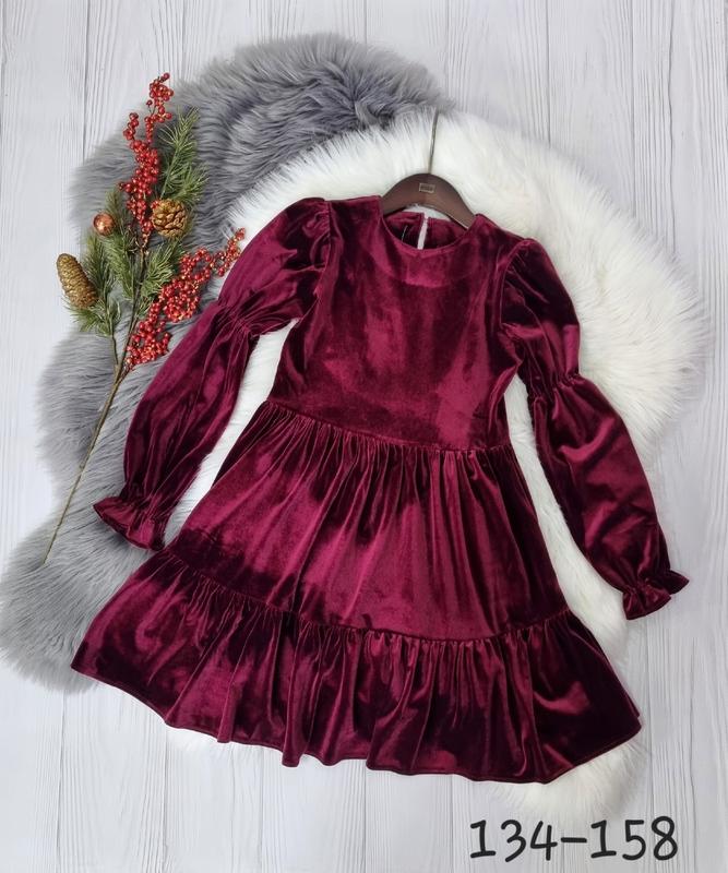 ландиш 💞Яскрава і ніжна святкова сукня тканина велюр мерехтіння в талії резиночка спинка застібається на гудзик колір бордо Гарна якість! 134(2 шт)-довжина 74,пог 33,рукав 50 140(4 шт)-довжина 77,пог 34,рукав 52 146(3 шт)-довжина 79,пог 35,рукав 55 152(3 шт)-довжина 81,пог 37,рукав 58 158(4 шт)-довжина 83,пог 39,рукав 61 +-2 см