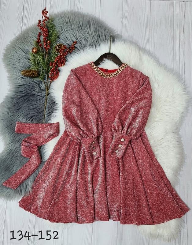 ландиш ✅️В НАЯВНОСТІ 💞Стильное платье для девочки ткань люрекс на трикотаже с середины приятная к телу(не колется) горловинка украшена цепочкой поясок в комплекті красиво тянется РЕКОМЕНДУЮ! 140(1 шт)-длина 75, пог 36,рукав 49 146(1 шт)-длина 78, пог 37,рукав 51 152(2 шт)-длина 81,пог 39,рукав 53 +-2 см