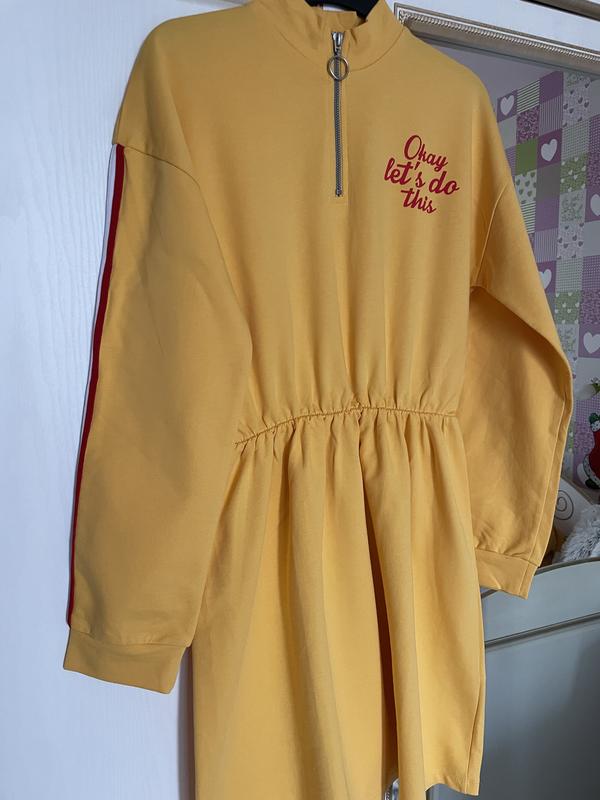 Сукня з довгим рукавом, горловина на блискавці, талія на резинці, на рукавах лампаси і трикотажний манжет
