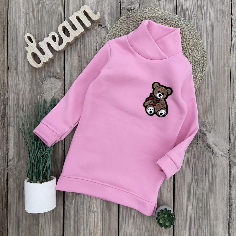 Платье из трехнитки – стильно, тепло и практично! Трехнитка на флисе- очень теплая и плотная! Медведик- нашивка. Снизу разрезы. Размеры: 60 (98-104) – рукав 30, длина 48, пог 31 64 (104-110) – 33/50/31 68 (116-122) – 38/55/34 72 (122-128) – 41/57/37