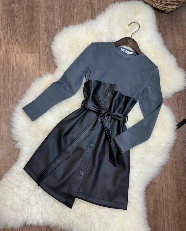арт 4253 Круте стильне платтячко Під поясок Тканина термо трикотаж + екошкіра на замші Оздоблено декоративними ґудзиками Приємне до тіла Супер якість! Зріст/довжина/пог/рукав від горловини Похибка+-2см 158/81/42/62-1шт Тан