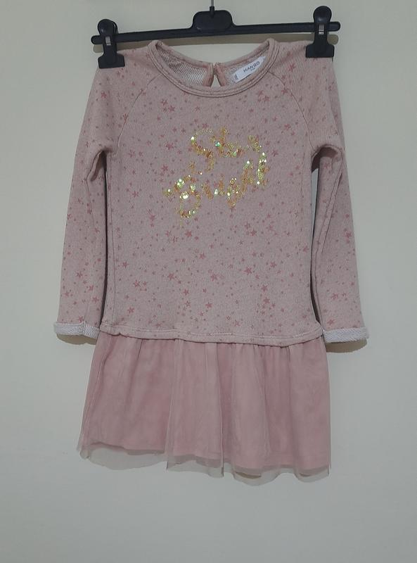 Плаття (сукня) тепле з аплікацією спереді, із спідничкою з фатину, з довгими рукавами реглан. Фірми MANGO KIDS. Розмір EUR S. Склад : верхня частина -81% бавовна, 19% поліестер; низ- два шари фатину з підкладкою із 100% бавовни. Тканина м'ягка, легка, приємна на дотик. Стан хороший. Заміри: ПоГ 33см ПоТ 32см Довжина рукава від горловини 32см Довжина 62см.