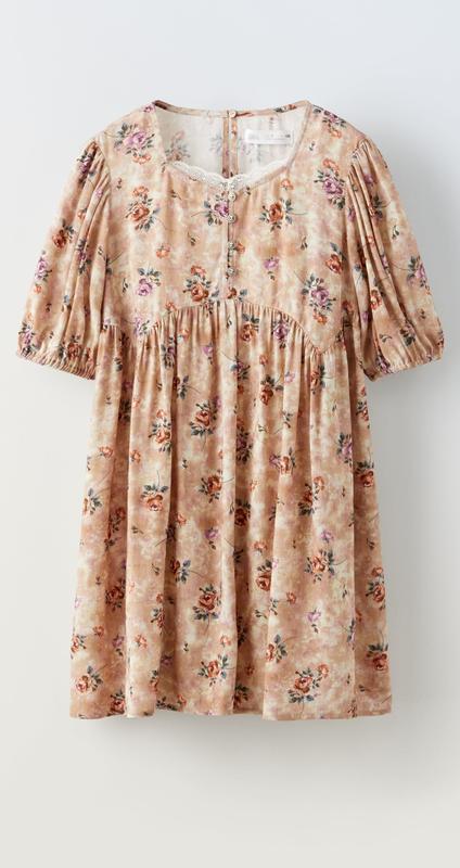 Сукня з V-подібним вирізом і короткими рукавами з еластичною обробкою. Спереду на ґудзиках. Вишиті деталі. Є підкладка. Розміри: 6-9 років.