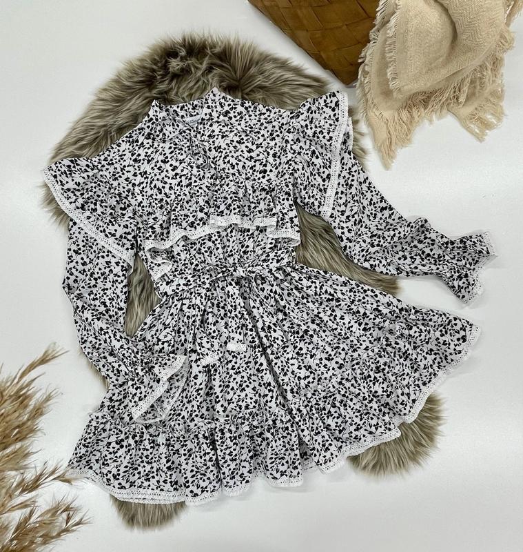 арт 4411 СУПЕР НОВИНКА! Весеннее-летнее платье из ткани нежный софт украшена игривыми воланами обшиты хлопковым кружевом в талии и рукава под резиночку поясок в комплекте РЕКОМЕНДУЮ! рост/длин./пог/рукав от горловины похибка +-2см 140/73/40/67-1шт 146/75/42/69-1шт 158/79/46/73-1шт