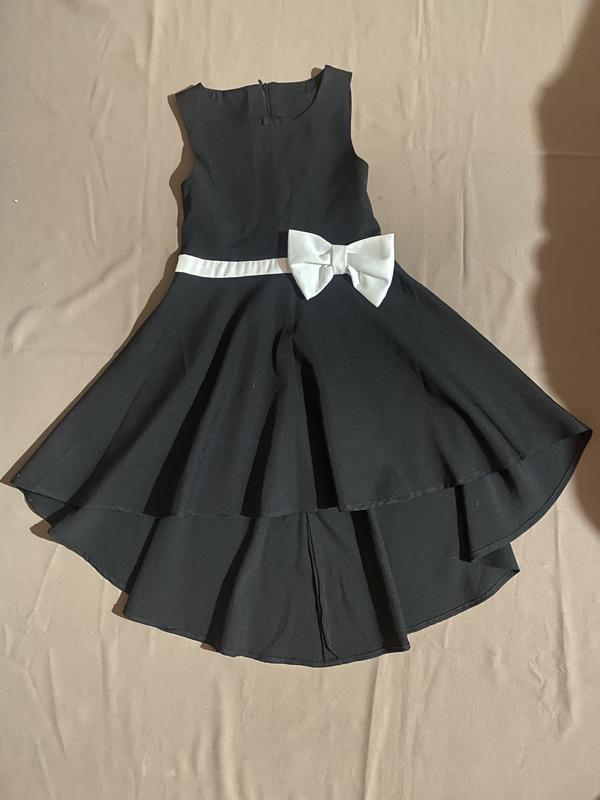 Сукня на дівчинку Подовжена ззаду; спереду декорована бантом; на спинці потаємна змійка Стан: новий (без паперової бірки) Розмір: на зріст 140 см/ 10 років (краще орієнтуйтеся по замірах) Заміри: півобʼєм по груді 34 см; довжина спереду 65 см; довжина ззаду 85 см; обʼєм пройми 44 см; плече 4,5 см; Тканина: поліестер Колір: чорний/білий