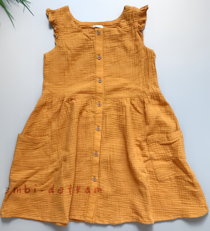 Сукня дитяча для дівчинки літня ТМ Бембі з рюшею по окату рукава, відрізна по талії. Спідниця призборена. По переду застібка на гудзики і накладні кишені. Матеріал - муслін, 100% бавовна. Розміри 122 та 134.