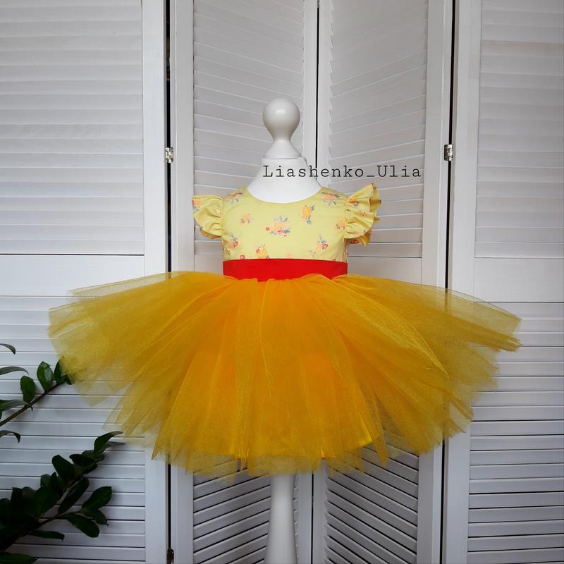 Дитяча пишна сукня на рочок . Верх виконаний із х/б тканини , низ - багато шарів фатін . Підкладка до тіла повністю виконана із х/б тканини . Сукня виконана у єдиному екземплярі !