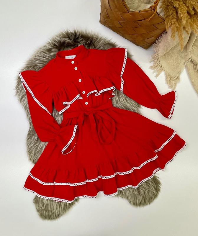 Таня арт 4539 НОВИНКА! Весняно-літня сукня з тканини креп-жатка прикрашена грайливими воланами обшиті бавовняним мереживом в талії та рукава під резиночку поясок у комплекті РЕКОМЕНДУЮ! зріст/довж./пог/рукав від горловини похибка +-2см 128/70/35/54-2шт 134/72/36/57-2шт 140/75/37/60-2шт 146/77/39/63-2шт 152/79/42/65-2шт