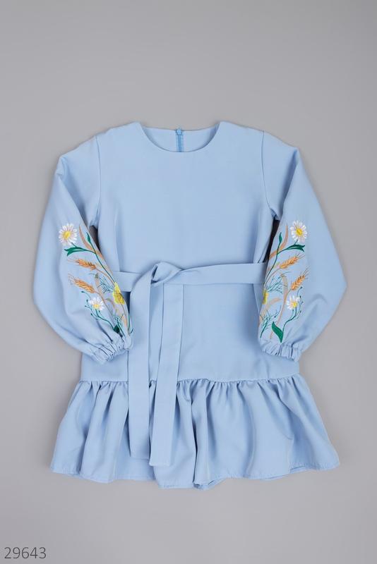 Сукня для дівчаток Колір: блакитний Матеріал: креп костюмка Країна виробник: Україна Сезон: Весна Розмірна сітка: 1-4 розмір Заміри: 1 розмір– плечі 32 см, рукав 48 см, ПО грудей 39 см, ПО талії 44 см, довжина 68 см. 2 розмір – плечі 33 см, рукав 49 см, ПО грудей 41 см, ПО талії 46 см, довжина 72 см. 3 розмір – плечі 34 см, рукав 51 см, ПО грудей 44 см, ПО талії 48 см, довжина 78 см. 4 розмір – плечі 35 см, рукав 53 см, ПО грудей 44 см, ПО талії 50 см, довжина 81 см . Припустима похибка у замірах 1-2 см. Робимо заміри однієї ростовки. *ПО-напівобхват