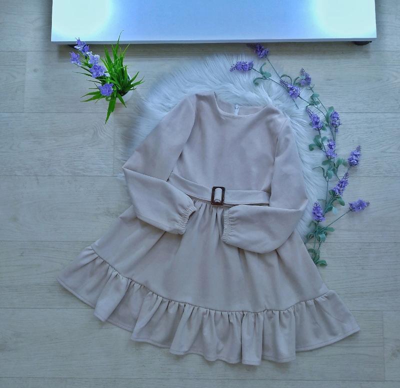 Вишукана сукня з пишною спідницею 💥💥🌸🌸🌸 Позаду є блискавка ,та резинка на рукавах , талія ругулюється поясом який йде в комплекті ,дуже якісна та щільна тканина, приємна до тіла 🥰🥰🥰🤩 Тканина: замш💫 Виробник: Україна 🇺🇦 ЗАМІРИ +/-1-2см!!! ▪р.134 довжина 69см/рукав від плечевого шва 47см /ПОГ 33см