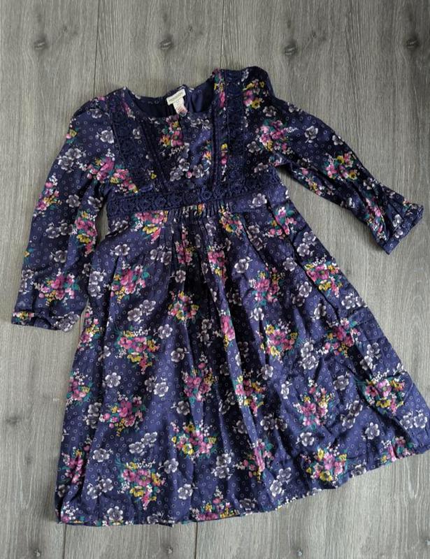 Ошатне плаття бавовна баклажанового, містно фіолетового кольору у квітковий принт.Розмір заявлений на 5-6 років.Ззаду на талії гумка, на підкладці ( бавовна) Довжина 67 см. Напівобхват грудей Плечі рукав
