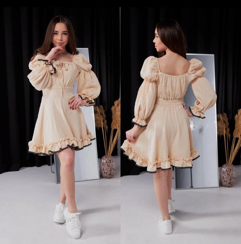 арт 4597 Невероятного красоты платье очень нежно смотрится в талии сзади под резинку пышный рукав фонариком из ткани пермиум качества муслин и сеточно Спереди функционирующая веревка Супер качество! Рост/длина/пог/рукав от горловины похибка+-2см 140-146/75/43/49-1шт 146-152/77/44/52-1шт 152-158/80/45/55-1шт 158-164/83/46/58-1шт 164-170/87/47/62-2шт Тан