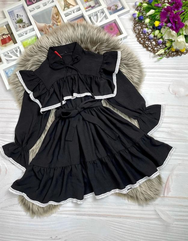 Стильна гарна сукня для красунь 💗 Тканина креп-жатка високої якості + мереживо, в поясі резинка, зав'язується під поясок Заміри: довжина/пог/рукав від плеча 128 - 69/30/46 140 - 76/32/49