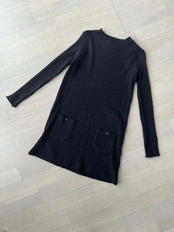 Постійно діюча акція: купуєте дві речі, третю, меншу за вартістю, отримуєте у подарунок (крім нових речей) Сукня в ідеальному стані. Насичений чорний колір (на фото трохи висвічує). Жодних нюансів. Матеріал приємний до тіла. 100% бавовна. Не утворює катишків. Плетіння «резинка». Добре тягнеться. Є дві накладні кишені. Заміри є на фото.