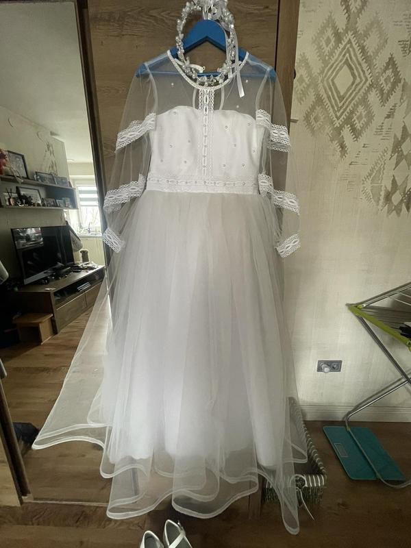 Плаття 146-152 В грудях ПО 34см В талії ПО 35 см Довжина від талії до низу плаття 84см Довжина самого пляття 123 см Плаття один раз одягнене на причастя.