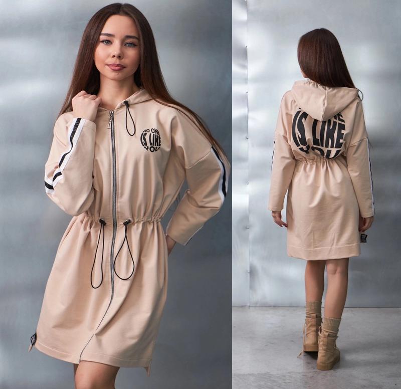 арт 4358 Супер новинка Сукня-туніка можна носить окремо як сукню а також під лосини тканина двунитка пеньє з якісним накатом попереду та позаду з капюшоном на утяжці рукава прикрашені лампасами попереду блискавка в талії утяжка СУПЕР ЯКІСТЬ! зріст/довжина по переду/пог/рукав від горловини похибка+-2см 140/70/56/55-1шт 146/75/57/58-1шт 158/82/62/61-1шт Тан