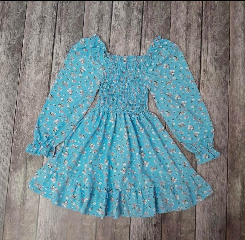 Мила сукня для дівчат. Тканина - софт, гарної якості. Верня частина сукні зібрана, гарно тянеться. Заміри: 140 довжина - 68см, напівобхват грудей - 23см, рукав- 57см. 146 довжина - 69см, напівобхват грудей - 23см, рукав - 59см. 152 довжина - 71см, напівобхват грудей - 24см, рукав - 61см.