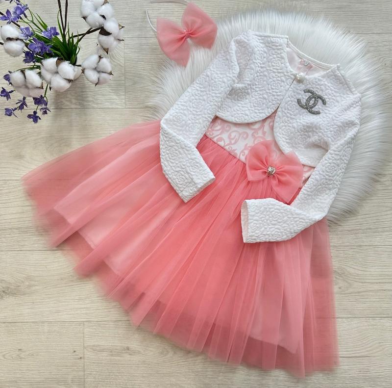 Неймовірної краси сукня з болеро та обручем в комплекті ❤️❤️❤️ Гарна, пишна, оздоблена вишуканими деталями 🥰😍🥰 Чотири шари фатину 😍 Пишний бант позаду 🎀 Застібка- потайна блискавка 🥰 Болеро на ґудзику та оздоблено лого з камінців 🤩 Обруч з бантиком в тон сукні 🎀 Є підкладка 👌🏻 Тканина: Сукня: верх- мереживо/ низ- фатин з підкладкою 💞 Болеро: французький трикотаж 🌸 Виробник: Україна 🇺🇦 ЗАМІРИ +/-1-2см!!! ▪р.116- Сукня: довжина 68см/ довжина спідниці 41см/ ПОГ 30см/ ширина талії 29см. Болеро: довжина 21см/ руав 42см ▪р.122- Сукня: довжина 71см/ довжина спідниці 43см/ ПОГ 33см/ ширина талії 31см. Болеро: довжина 23см/ руав 45см ▪р.128- Сукня: довжина 76см/ довжина спідниці 46см/ ПОГ 35см/ ширина талії 32см. Болеро: довжина 24см/ руав