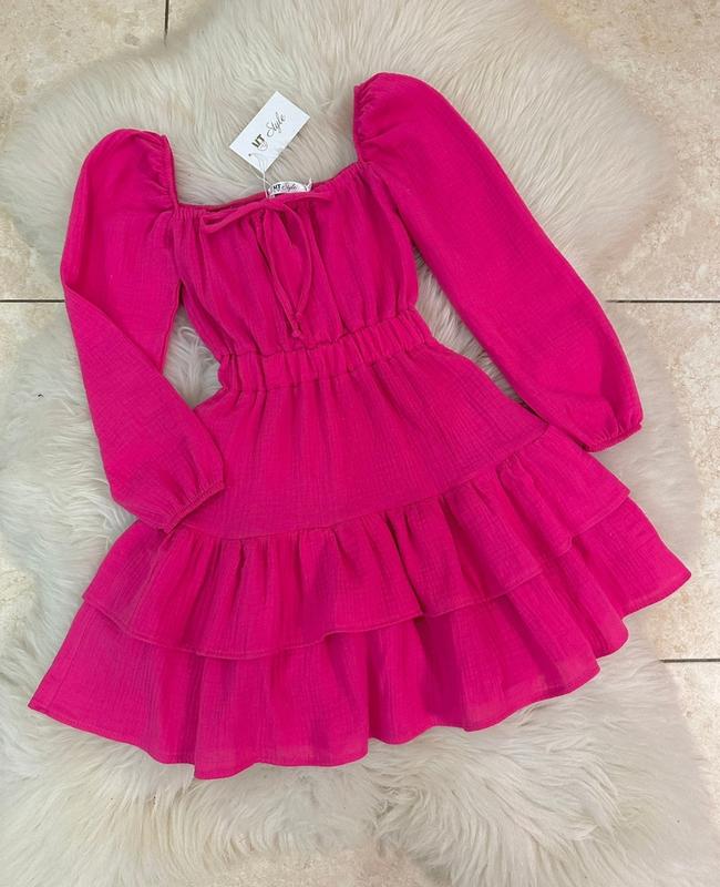 Стильна та ніжна сукня для дівчат. М'яка, легка та приємна до тіла. Пояс на широкій резинці. Тканина - муслін (натуральна) Заміри: 134 довжина від плеча - 69см, напівобхват грудей - 30см, рукав від плеча - 49см. 140 довжина від плеча - 72см, напівобхват грудей - 32см, рукав від плеча - 50см. 146 довжина від плеча - 74см, напівобхват грудей - 35см, рукав від плеча - 53см. Мс