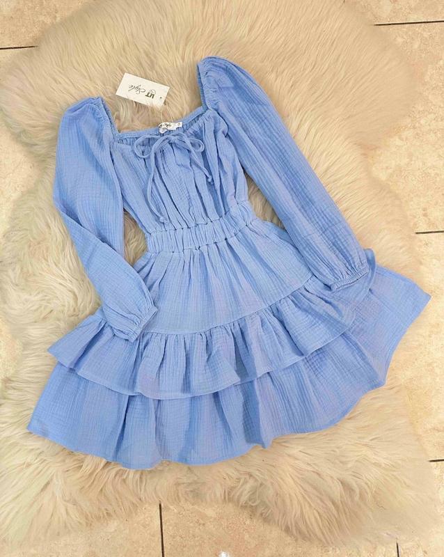 Стильна та ніжна сукня для дівчат. М'яка, легка та приємна до тіла. Пояс на широкій резинці. Тканина - муслін (натуральна) Заміри: 134 довжина від плеча - 69см, напівобхват грудей - 30см, рукав від плеча - 49см. 140 довжина від плеча - 72см, напівобхват грудей - 32см, рукав від плеча - 50см. 152 довжина від плеча - 79см, напівобхват грудей - 37см, рукав від плеча - 54см. Мс