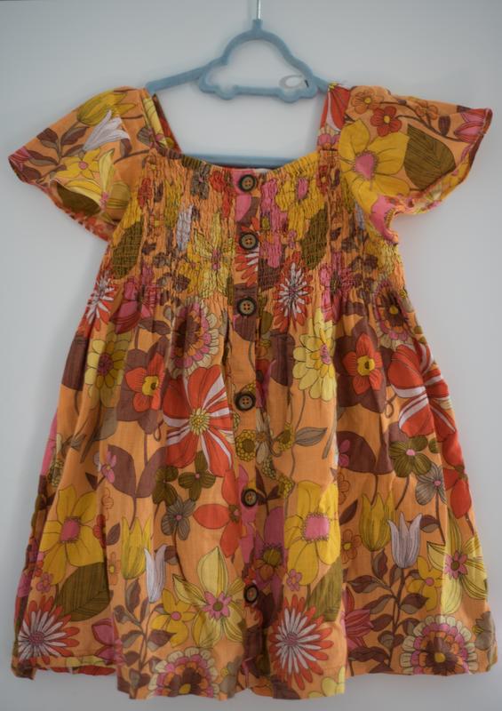 Яскрава сукня з квітковим принтом для дівчинки. Після моєї дитини (не секонд). В гарному стані, дефектів немає. 100% бавовна. Заміри: довжина - 51 см, ширина у грудях - 28 см (на гумках, ще тягнеться). Відправка будь-якою поштою.