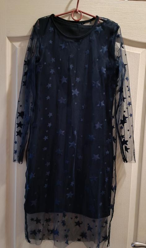 Нарядна сукня 2 в 1. Темно синього кольору плаття та прозора накидка з зірками, Можна носити без накидки. Прямого крою, одягали 1 раз. Розмір 152.