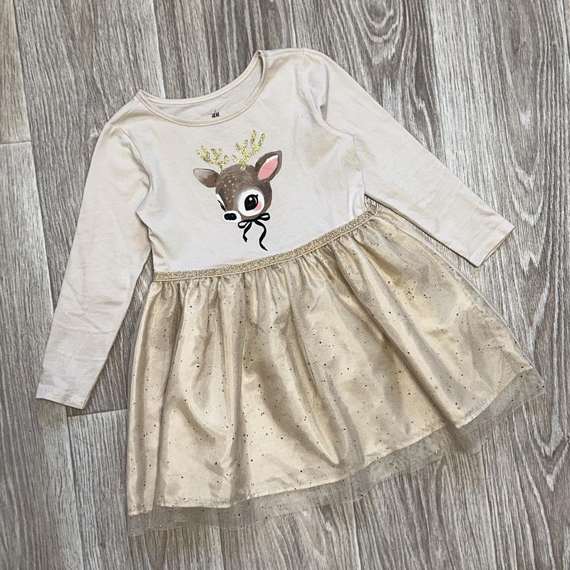Плаття з малюнком і блискучою спідницею на підкладці. Верх Котон як футболка Стан чудовий 🏷️H&M 🎯2-4 роки/198-104 (2) Довжина 54 (22). ПОГ 30. Рукав 34 🎯4-6 лет/110-116 Довжина 60 (25). ПОГ 31. Рукав 40ʼ5