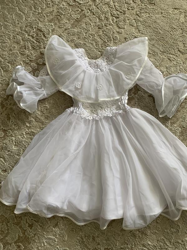 Белое пышное платье на девочку в отличном состоянии.Длина 75 см., длина рукава 40 см., под руками 35 см., пояса см, резинка, тянется.