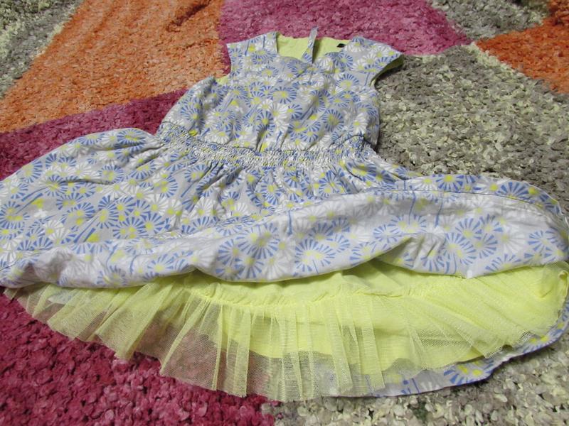 12-18 міс. по бірці. Більшомірить. Позаду замок. Заміри: довжина 46 см., ширина зверху (по плечах-рукавчикам) 25 см., ширина під пахвами 24 см., ширина в талії 25 см. (Можна потягнути до 31 см., приблизно) ширина внизу спідниці 60 см.