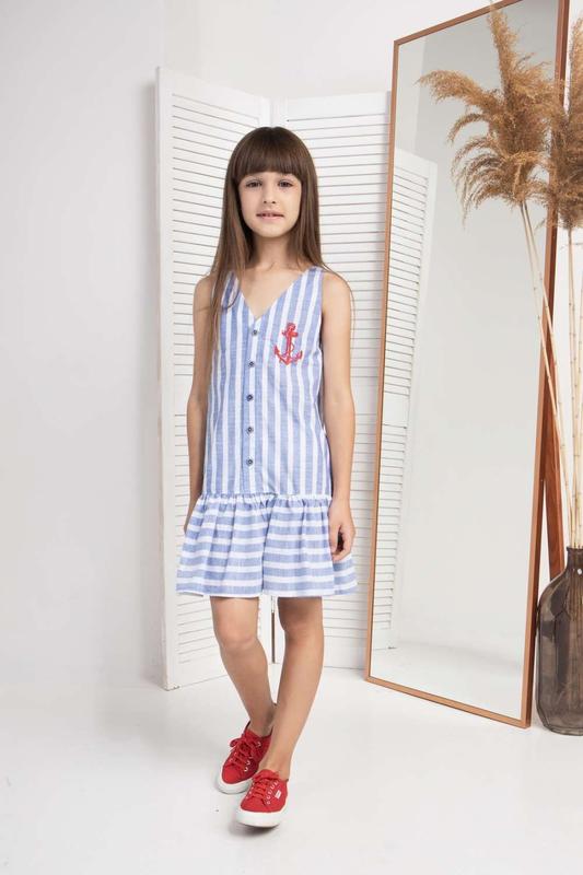 Полосатое платье на девочку - морской принт - Поплин. Размер: 6-7, 8-9, 10-11, 12-13 На модели размер 8-9 ЗАМЕРЫ (полуобхват груди / длина кофты) 8-9 (39/66); 12-13 (42/73) Материал: 100% хлопок. 85643