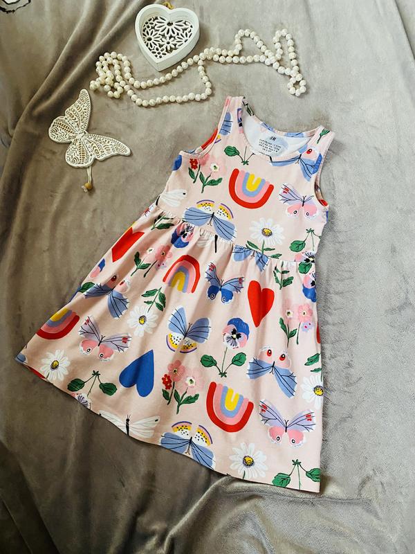 Красивое коттоновое платье H&M с ярким летним принтом. Стан идеален. Размер 98-104 (3-4 года), но лучше ориентироваться на замеры. Длина по спинке 51 см. ПОГ 27 см. Доп. фото и замеры по требованию.