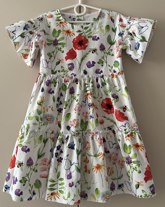 Сукня на дівчинку 5-6 років. Матеріал - бавовна 100 % . Довжина сукні - 65 см, пог - 32 см, довжина зверху до спідниці - 26 см, довжина спідниці - 39 см, довжина рукава від горловини - 19 см.