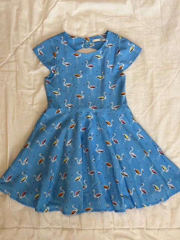 Чудовий стан. Збоку є блискавка, на спині виріз. Дуже приємне до тіла, гарно сідає. Вашій доньці воно обов'язково сподобається) А особливо, коли крутишся в ньому)) Розмір і заміри на фото.