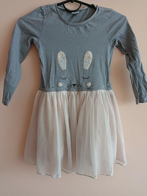 Ніжне плаття марки Next. Розмір 110, думаю можна носити до 120 см) пишна спідниця з двох слоїв фатіну та одного слою підкладки) Є маленький недолік на останньому фото, його не видно в носці, якщо не знати що він там є, то і непомітно. Ідеальний варіант для дитячого садочку)