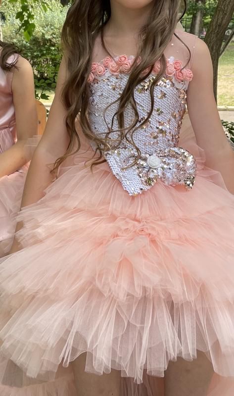 Чудове персикове плаття. Підійде на вік від 5 до 7 років. Шлейф за бажанням знімається. Є від нього коробка. Обʼєм за бажанням регулюється. Від 116 см до 128 см. В ідеальному стані. Відправка укр поштою або новою