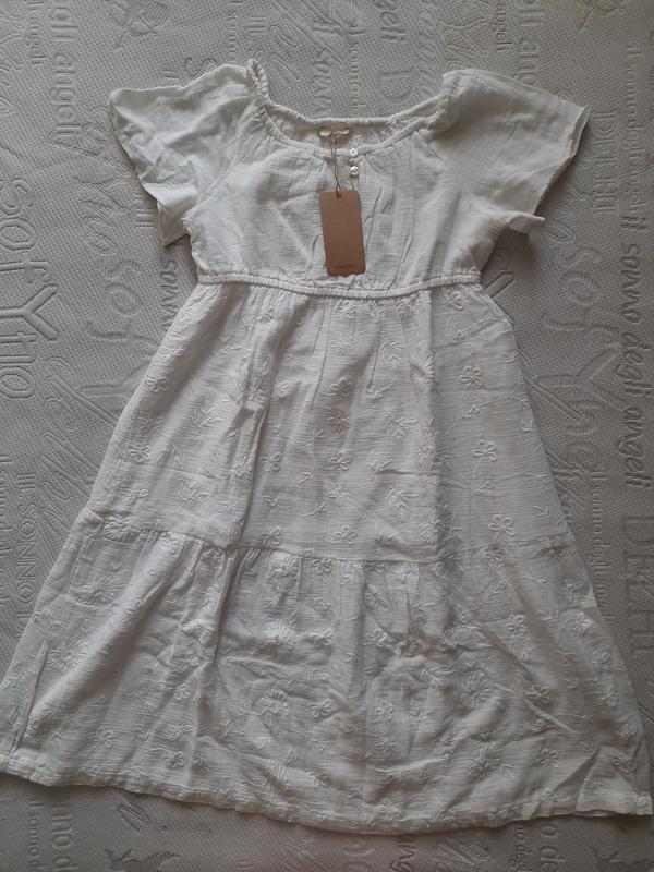 Красивое, оригинальное платье с вышивкой Mango на 7-9 лет (по бирке на 7-8 лет), но они больше мерят, смотрите за измерениями.. Склад 100% котон. Есть подюбник. Горловина на резинке. Платье свободного кроя. Замеры: __7-8 лет (128-134 см).: _дл-85 см, дл до резинки по груди -24 см, ширина по отрезу по груди-33 см (резинка), по груди-36 см, ширина горловины-19 см., Глубина-11 см., ширина по отрезу волана-60 см.