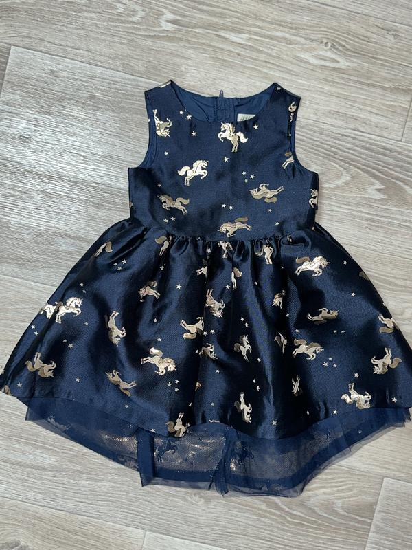 Сукня синього кольору із золотистими єдинорогами. Ззаду трохи довше. Пишне. Стан нового 🏷️H&M 2-3 роки/98 Довжина 53-60 (23). НОГ 29