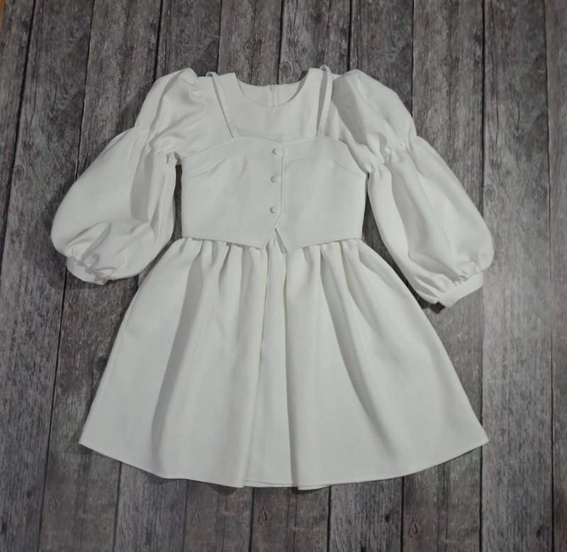 Стильна сукня для модниць По спинці до пояса застібається на блискавку. Тканина- костюмна, топ - екошкіра. Колір сукні- МОЛОЧНИЙ. Заміри: 140 довжина - 72см, рукав від горловини - 55см, напівобхват грудей - 34см 146 довжина - 76см, рукав від горловини - 59см, напівобхват грудей - 37см 152 довжина - 82см, рукав від горловини - 64см, напівобхват грудей - 39см 158 довжина - 86см, рукав від горловини - 66см, напівобхват грудей - 41см