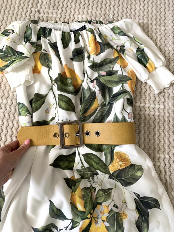 Легке літнє плаття, білого кольору з малюнком лимонами, не просвічується, має підкладку. Пояс чудово прикрашає та підкреслює фігуру. Розмір S. В ідеальному стані, було одягнено декілька разів.